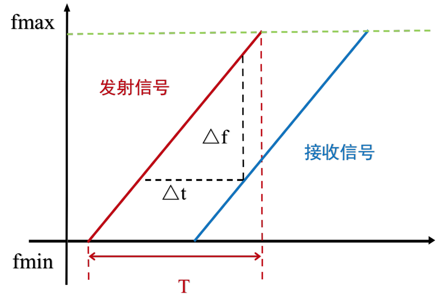 During each sweep cycle, the FMCW radar transmits a continuous wave with varying frequency. The echo reflected from an object is received and superimposed with the transmitted signal. The received signal exhibits a time delay relative to the transmitted one, as illustrated in the figure. Directly measuring this small time delay is challenging in practice (though some studies attempt to do so). To address this, the time delay is converted into a measurable frequency difference—the core advantage of FMCW.