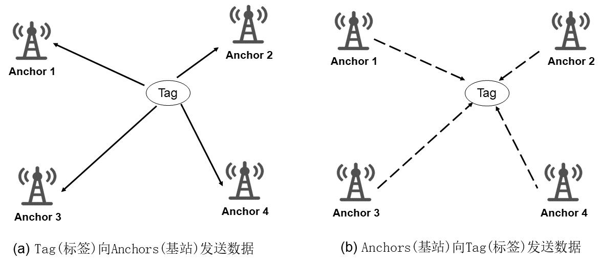 - Second configuration: All base stations simultaneously transmit signals toward the tag, and the tag records the time differences at which these signals arrive.