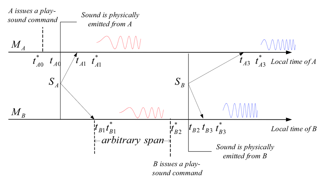 The sound from device B reaches device A’s microphone at \(t_{A3}\), and the application detects it at \(t^∗_{A3}\).