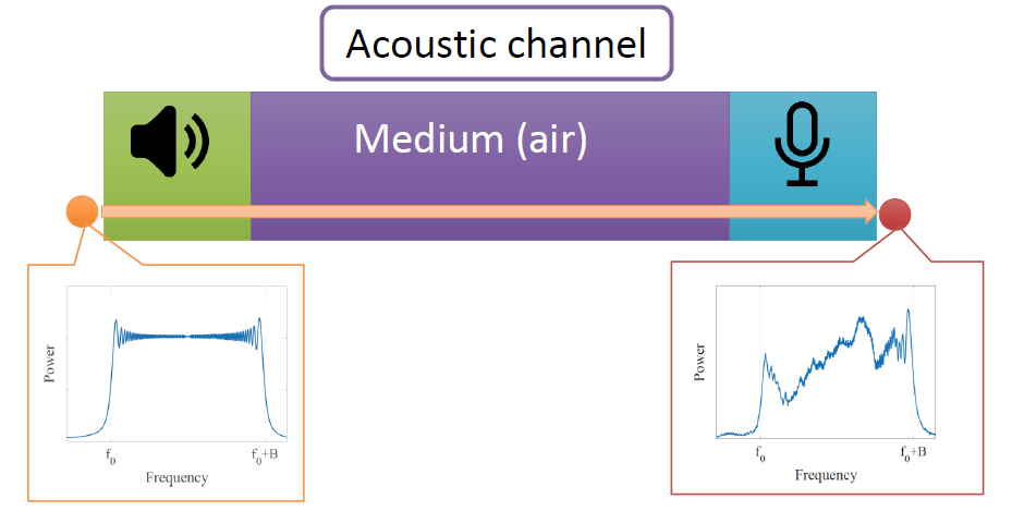 These distortions arise from the frequency-selective nature of the acoustic channel. The acoustic channel consists of the speaker, the propagation medium (air), and the receiving microphone—all of which introduce frequency-dependent responses. Speakers and microphones, due to manufacturing imperfections, inherently amplify or attenuate certain frequencies differently. Meanwhile, the propagation medium introduces multipath effects: signals arriving via multiple paths interfere at the receiver. Some frequencies experience constructive interference (amplification), while others undergo destructive interference (attenuation). This results in a unique frequency response pattern shaped by the entire channel. The figure below illustrates the overall frequency selectivity of an acoustic channel.
