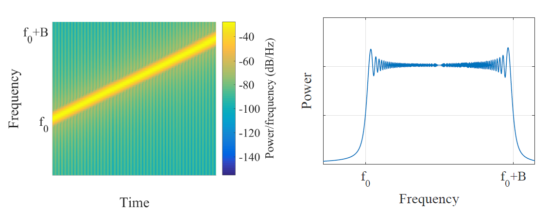 Speakers and microphones used for sound signal transmission and reception also exhibit such hardware-specific frequency selectivity. A standard chirp signal appears as shown below in both the time-frequency and frequency-domain representations. In the time-frequency plot, the chirp signal manifests as a linear frequency sweep; in the frequency-domain plot, it shows approximately uniform energy distribution across its bandwidth.