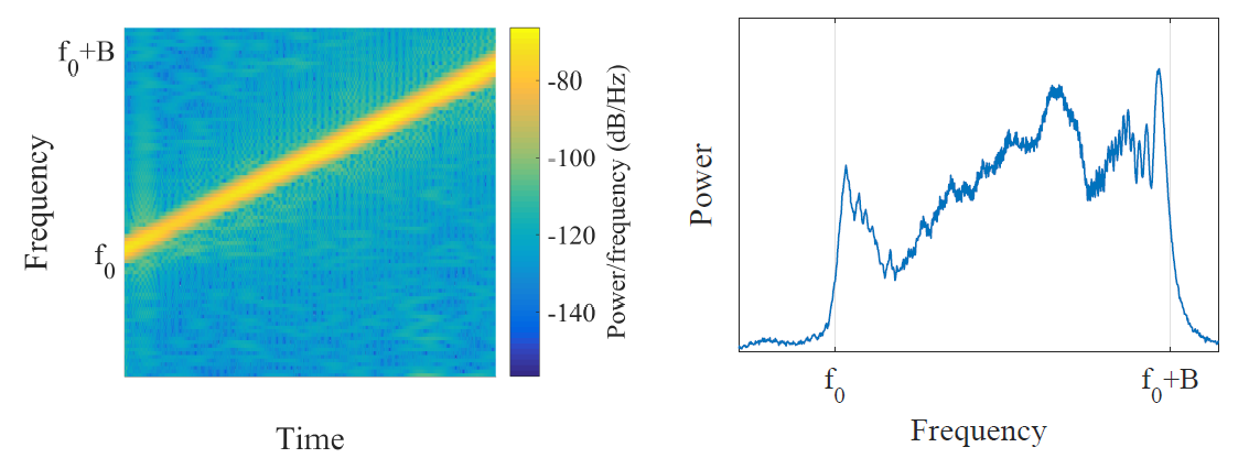 When this standard chirp signal passes through an acoustic channel—transmitted by a speaker, propagated through air, and received by a microphone—the resulting time-frequency and frequency-domain plots appear as shown below. While the time-frequency representation still resembles a clean sweep with minimal distortion, the frequency-domain plot reveals significant irregularities in energy levels across the chirp’s bandwidth.