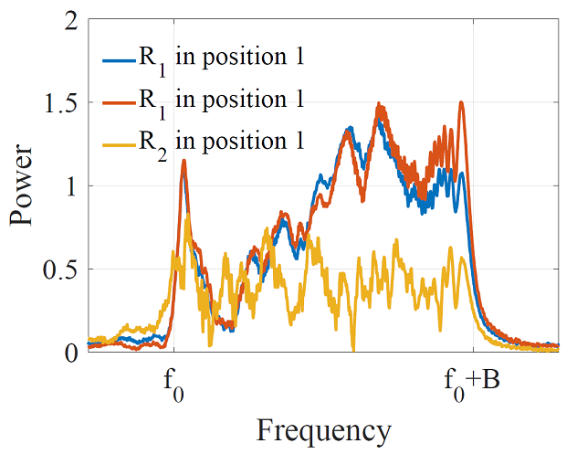 To investigate whether such frequency selectivity can effectively distinguish between different devices or communication channels, we conducted experiments using a fixed sound source and two different receiving devices placed at the same location. The results shown below illustrate the frequency selectivity observed when the transmitting device and multipath environment remain constant, but different receivers are used. The blue and red lines represent two repeated recordings from Device 1 at Position 1. The yellow line represents a recording from Device 2 at the same position. It is evident that repeated measurements from the same device are highly consistent, whereas the response from a different device differs significantly. This observation suggests that frequency selectivity of acoustic signals can be used to differentiate between hardware devices.