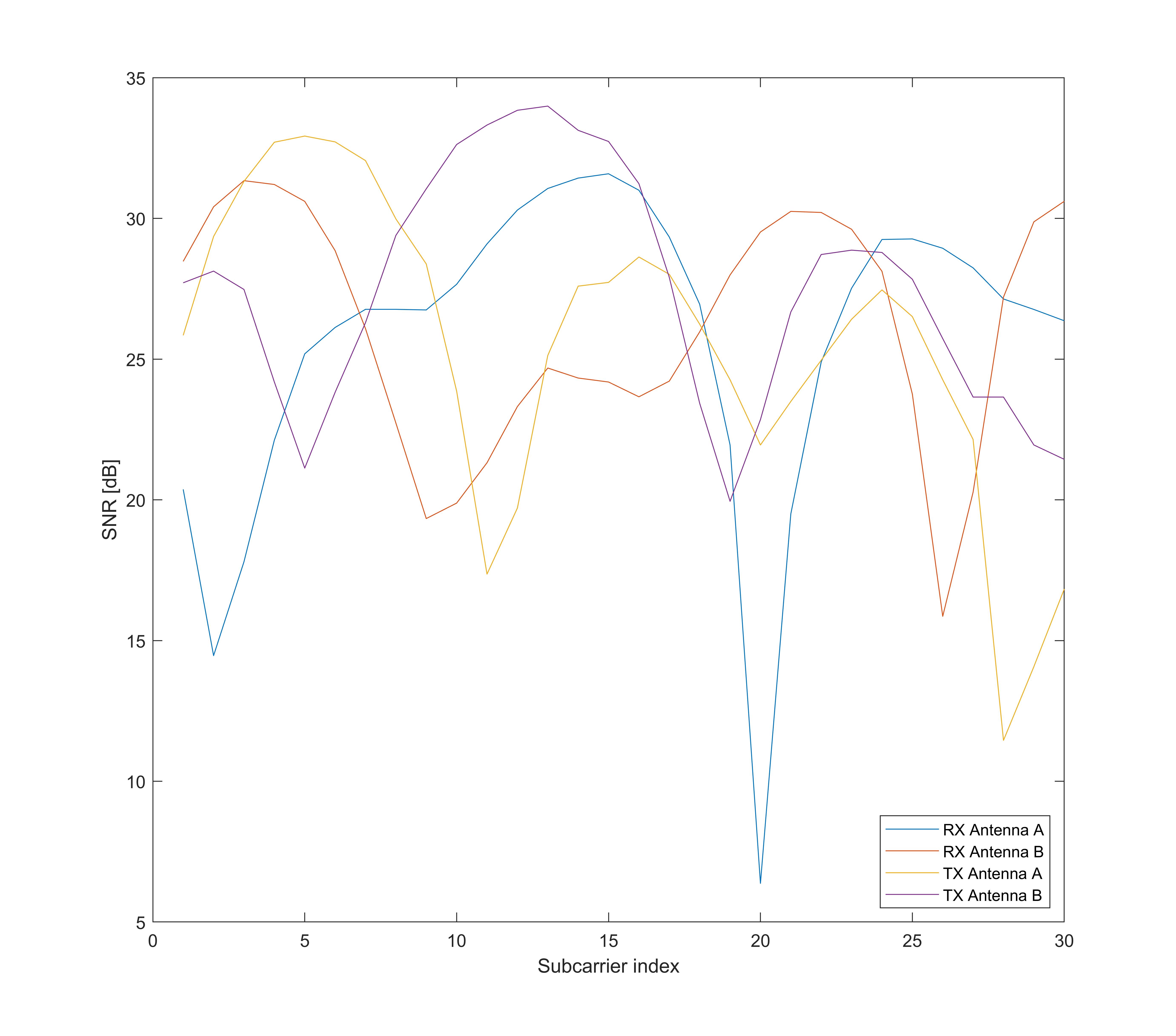 The figure above illustrates the SNR results converted from CSI data acquired using a 2×2 (nTx×nRx) antenna configuration. The horizontal axis represents the 30 distinct subcarriers, while the vertical axis shows the corresponding SNR values.