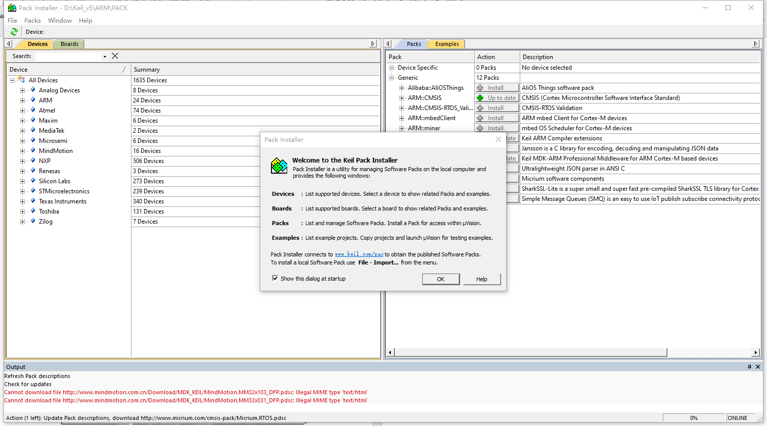 After installation completes, launch Keil; the package installation interface appears. Note the progress indicator in the lower-right corner.