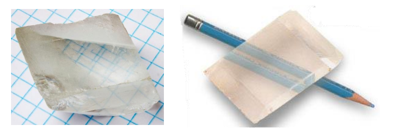 When light enters an anisotropic crystal, it splits into two refracted rays—a phenomenon termed birefringence. Common naturally occurring birefringent crystals include quartz, calcite, and ruby. Beyond natural crystals, many polymeric materials—including plastics—exhibit optical anisotropy due to molecular alignment induced during manufacturing processes (e.g., stretching or extrusion), thereby producing birefringent effects. As illustrated below, the birefringence of a calcite crystal causes both grid lines and a pencil drawn on paper to appear doubled.