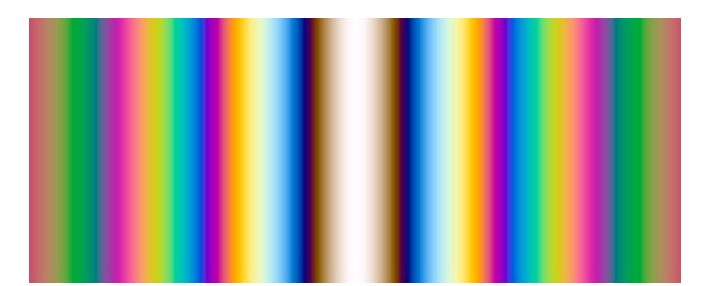 When the monochromatic source in the double-slit setup is replaced by broadband (polychromatic) light, the optical path difference at any given screen location remains unchanged. Yet now, this fixed path difference translates into different phase differences for different constituent wavelengths—leading to wavelength-dependent constructive/destructive interference at each location. Consequently, the spectrum of the incident polychromatic light is reshaped: wavelengths undergoing constructive interference are enhanced, whereas those undergoing destructive interference are suppressed. Under fixed path difference, this effect on broadband light resembles frequency-selective filtering. If the incident light is white light—containing roughly equal intensities across the visible spectrum—it appears white before interference. After interference, intensities at certain wavelengths increase while others decrease; dominant wavelengths (with highest post-interference intensity) exert the strongest influence on the perceived color. Spectral redistribution due to interference causes the emergent light to exhibit distinct colors. Because path differences vary across screen positions, interference outcomes differ spatially—yielding the colorful fringe pattern shown below.