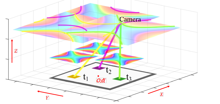 As shown above, \(t_1\), \(t_2\), and \(t_3\) denote three optical films at known positions \(p_1,p_2,p_3\). A camera located at \(p_{cam}\) simultaneously images all three films. Analyzing the captured image yields hue values \(h_1,h_2,h_3\) for the three films’ coloration. Leveraging the established mapping between film coloration and viewing angle, along with the films’ known coordinates \(p_1,p_2,p_3\), we obtain candidate spatial ray sets \(G_1,G_2,G_3\) originating from each film. Every point on ray set \(G_i\) observes hue \(h_i\) at film \(t_i\). Among the ray sets \(G_1,G_2,G_3\), at least one ray must pass through the true camera location \(p_{cam}\). A point simultaneously intersected by three rays—one from each of \(G_1,G_2,G_3\)—is defined in this work as the common intersection point of ray group \(G_1,G_2,G_3\). Solving for the common intersection point of the three ray sets \(G_1,G_2,G_3\) thus yields the camera’s position \(p_{cam}\).