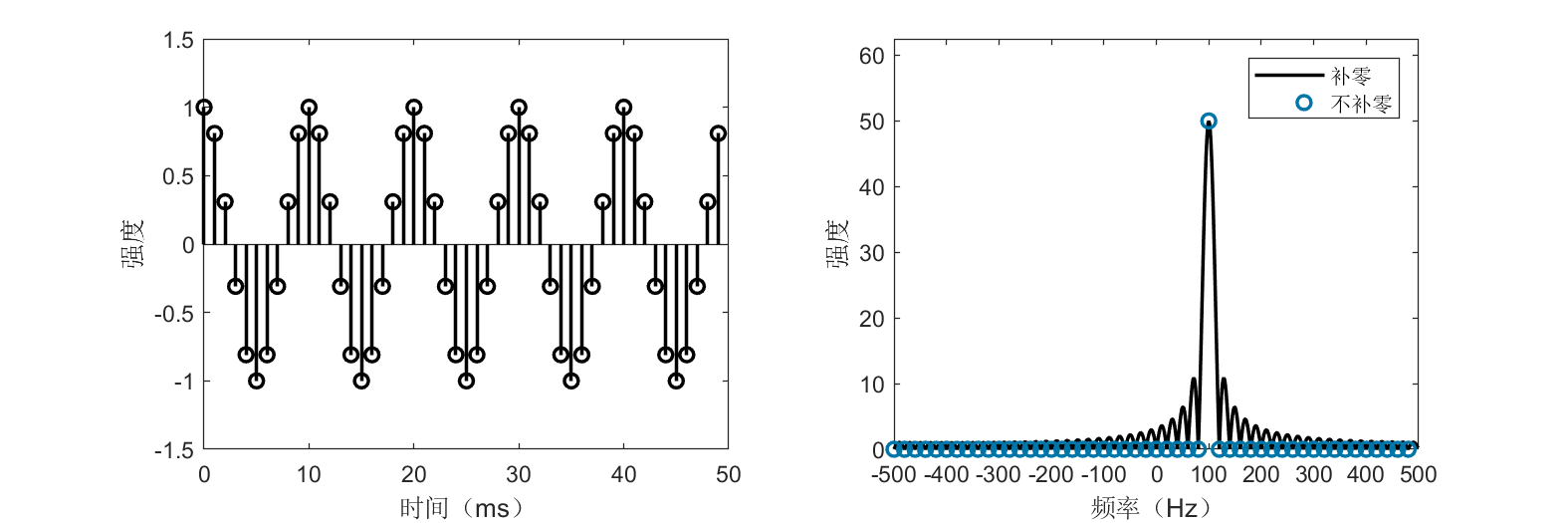 Unlike integer-period truncation, non-integer-period truncation causes spectral leakage or distortion. As shown, blue circles no longer align with spectral peaks. Regardless of sampling duration increase, the unpadded spectrum persistently indicates multiple significant frequency components besides 100 Hz. In such cases, zero-padding to enhance spectral resolution becomes essential.