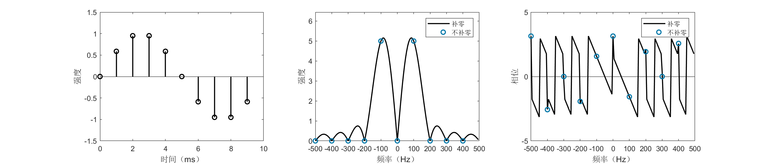 A curious phenomenon appears: when sampling exactly one period, the unpadded spectrum indicates a pure 100-Hz component, whereas the 16× zero-padded, higher-resolution spectrum shows the dominant peak deviating from 100 Hz (blue circles misaligned with black curve maxima). Why? Because a real sine wave comprises two frequency components: \(+100\) Hz and \(-100\) Hz. Due to signal finiteness, these generate sidelobes that interfere, perturbing the ideal 100-Hz peak. This effect diminishes as sidelobes shrink.