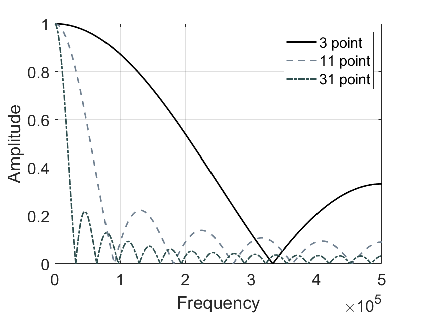 Earlier, we stated that the moving average filter provides optimal random noise suppression in the time domain, yet performs poorly in frequency-domain band-separation tasks. First, we examine the frequency response of the moving average filter using a MATLAB simulation: