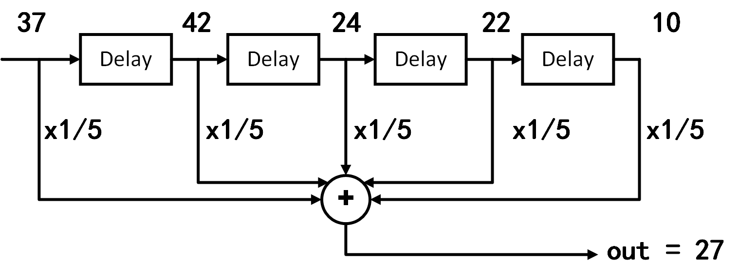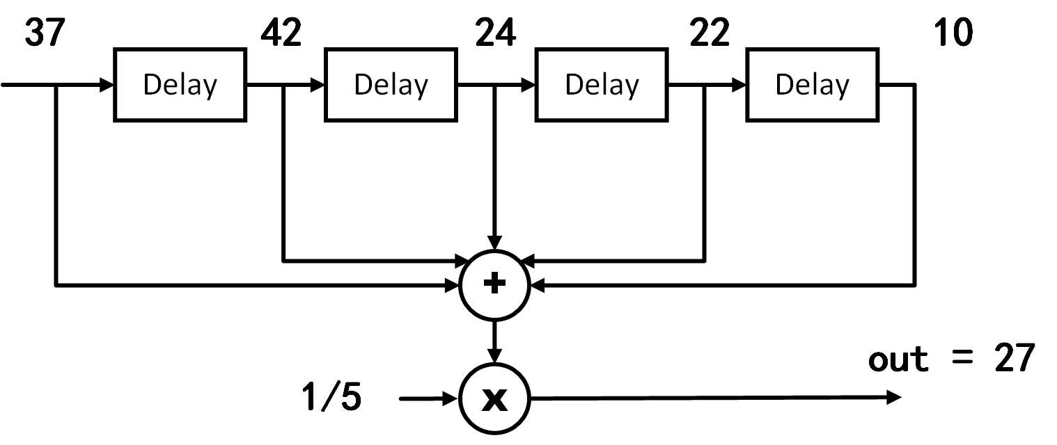 From this equation, it is evident that each moving-window average computation is equivalent to summing all inputs within the window and dividing by the window length (as illustrated in the figure below).