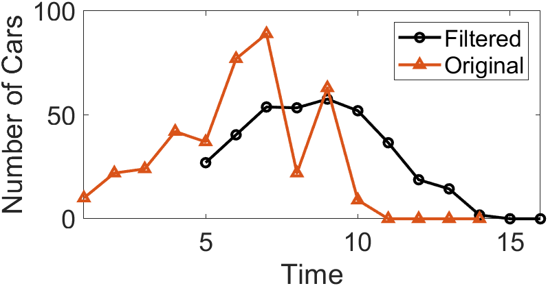 By default, the n-th output of movmean() corresponds to a window centered at the n-th input element. Alternatively, the position of the n-th window relative to the input sequence can be explicitly specified. For example, M = movmean(A,[kb kf]) computes the mean over a window of length kb+kf+1, which includes the current element, kb subsequent elements, and kf preceding elements. Below is the MATLAB code used to compute the moving average of vehicle counts: