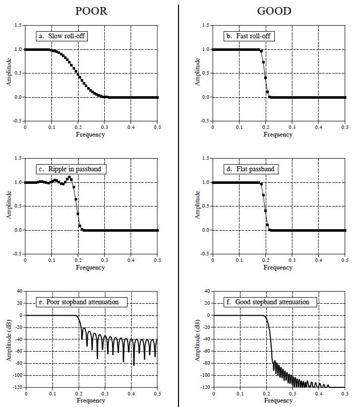 Stopband attenuation: To adequately block stopband frequencies, strong stopband attenuation is required, as shown in Figure (f).