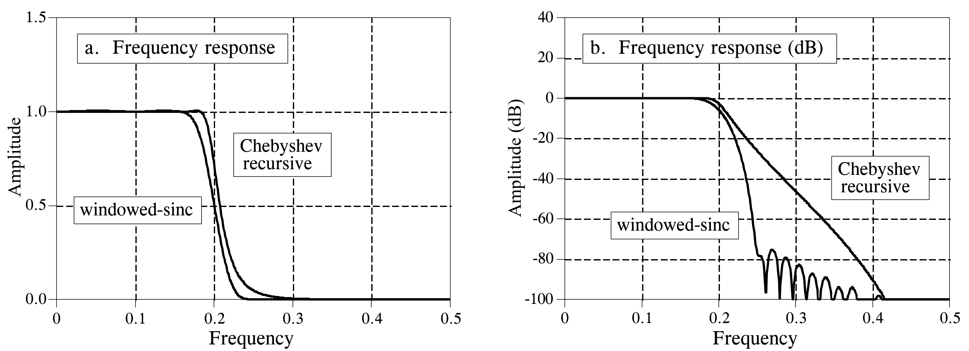 To answer this question, we constructed a sixth-order Chebyshev low-pass filter with 0.5% passband ripple and a 51-tap FIR filter, and compared their performance.