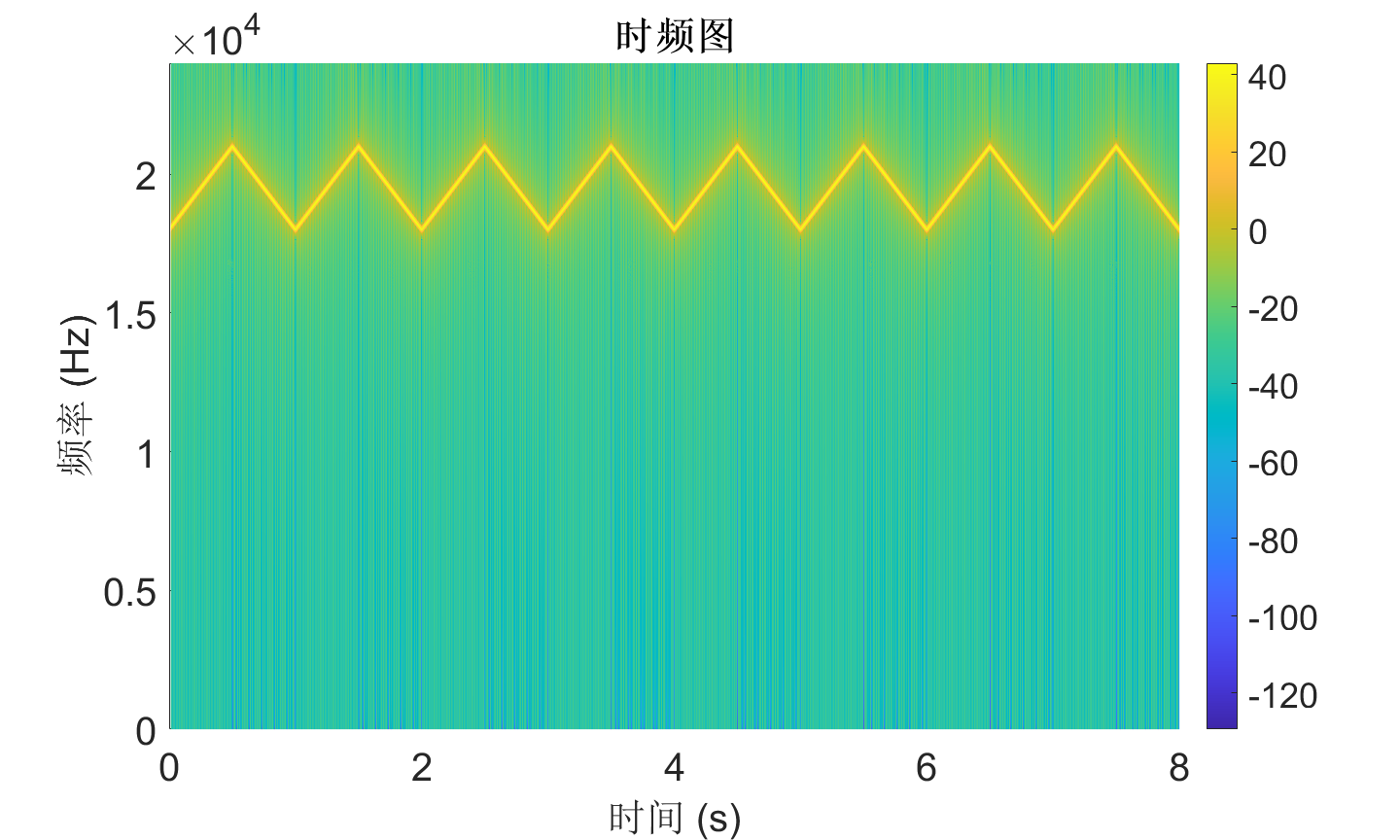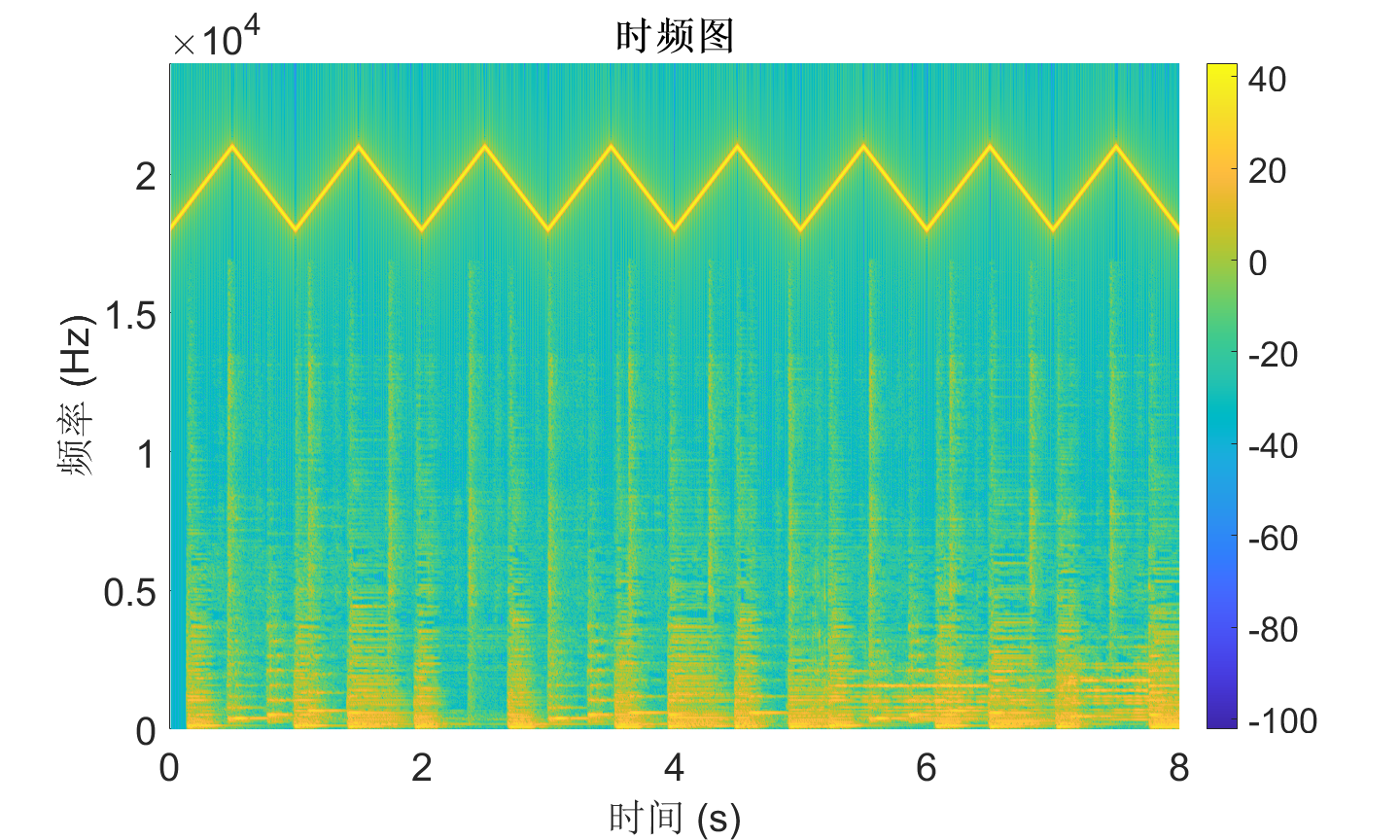 Within the frequency range perceptible to the human ear (\(\leq 18000\text{Hz}\)), the spectrogram displays features corresponding to the musical melody. However, in the ultrasonic band (\(> 18000\text{Hz}\)), there is a hidden signal with linearly changing frequencies that alternate between ascending and descending (chirps). Since this signal is in the ultrasonic range, it exceeds the range of human hearing; thus, only the normal music is audible. This technique of embedding ultrasonic signals into regular music can be applied to the Internet of Things (IoT) to achieve functions like inaudible communication and sensing.