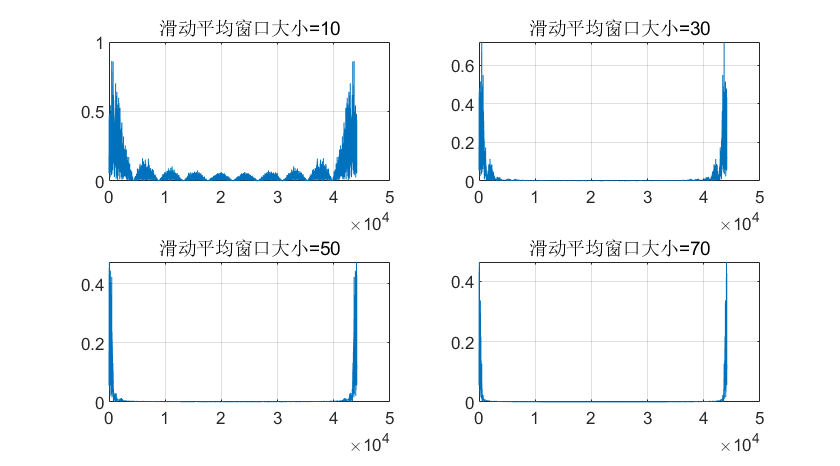 Next, we adjust the moving-window length (to values of 10, 30, 50, and 70) and plot the corresponding spectra to analyze how window length affects filtering performance.