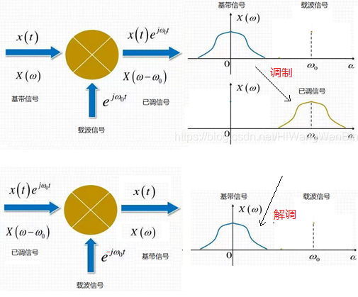 The figure below illustrates the spectral shifting involved in both upconversion (modulation) and downconversion (demodulation).
