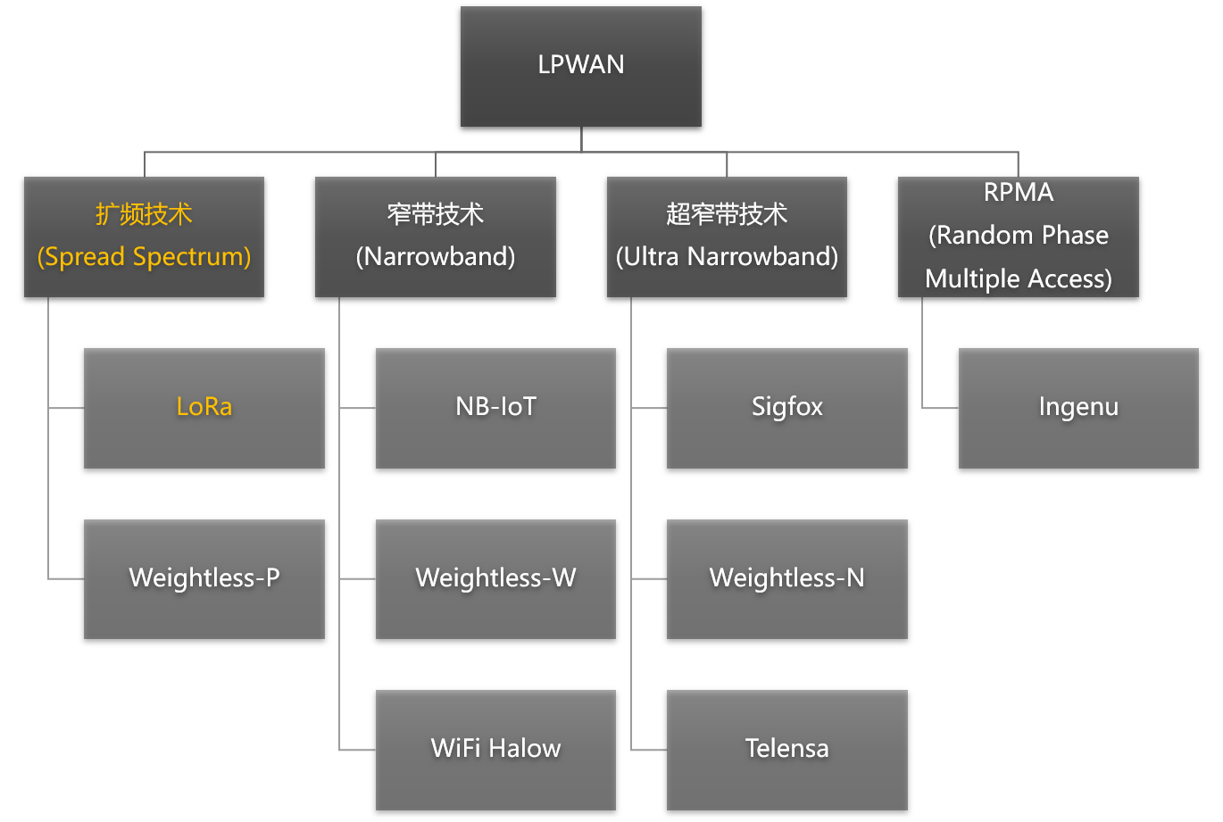 LPWAN (Low-Power Wide-Area Network) refers to a class of networks characterized by ultra-low power consumption, long communication range, and massive device connectivity—ideally suited for the “Internet of Everything” vision of IoT. LPWAN is not a single technology but rather an umbrella term encompassing a family of diverse low-power wide-area networking technologies, as illustrated below. Among them, LoRa employs spread-spectrum modulation, whereas NB-IoT utilizes narrowband modulation—two representative LPWAN technologies.