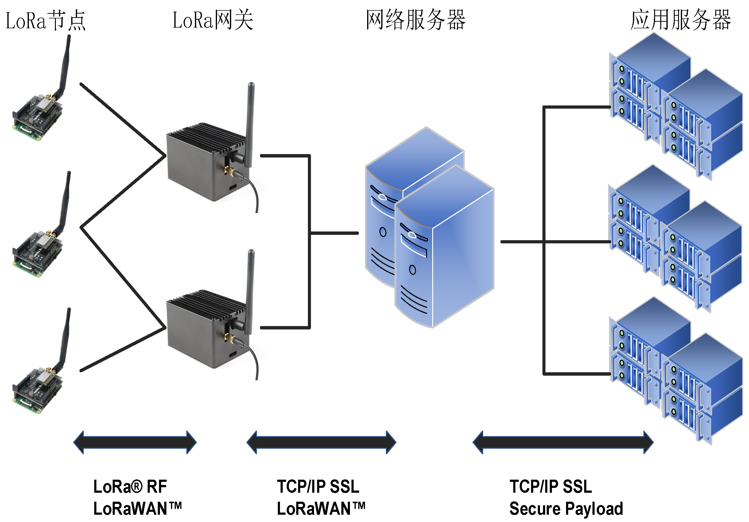 The prevailing LoRa architecture comprises end-nodes, gateways, and servers, as illustrated below.