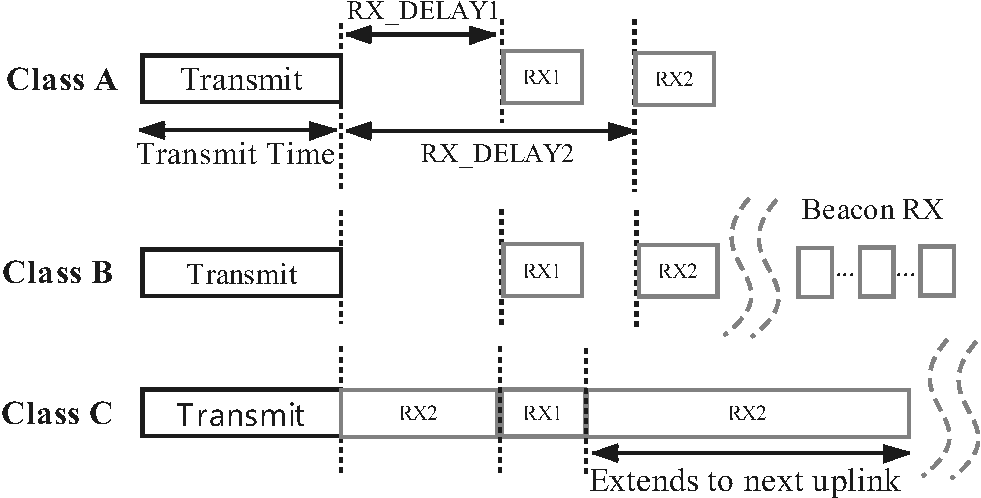 For diverse application scenarios, LoRaWAN defines three end-node operation classes: Class A (ALOHA), Class B (Beacon), and Class C (Continuously Listening):