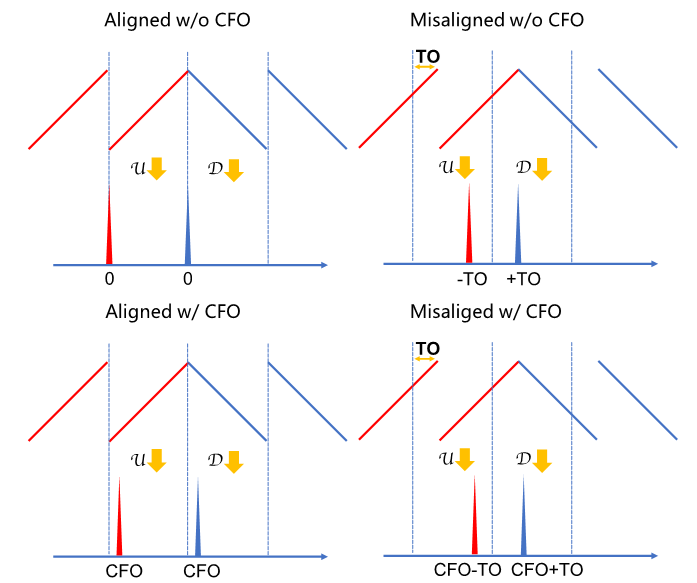 Because cyclic frequency shifting may produce a starting frequency equal to the original minus BW, when the sampling rate exceeds BW, two non-overlapping spectral peaks arise—one at the original frequency \(f_0\) and another at \(Fs-BW+f_0\). Therefore, if the receiver’s sampling rate exceeds BW, the two peaks must be coherently summed in the frequency domain to concentrate the full chirp energy. To maximize summation gain, we search over all possible relative phase offsets between the two peaks and select the one yielding the largest resultant peak magnitude.