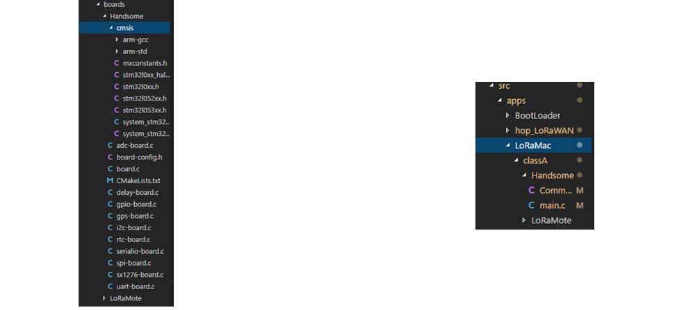 boardsfolder—namedHandsomehere. Required file structure is shown below. Hardware modifications focus on MCU and radio drivers; copy similar existing implementations. Crucially,board-config.hdefines pin mappings.Fig. Node code and application code directories.After defining the board, create a corresponding application under