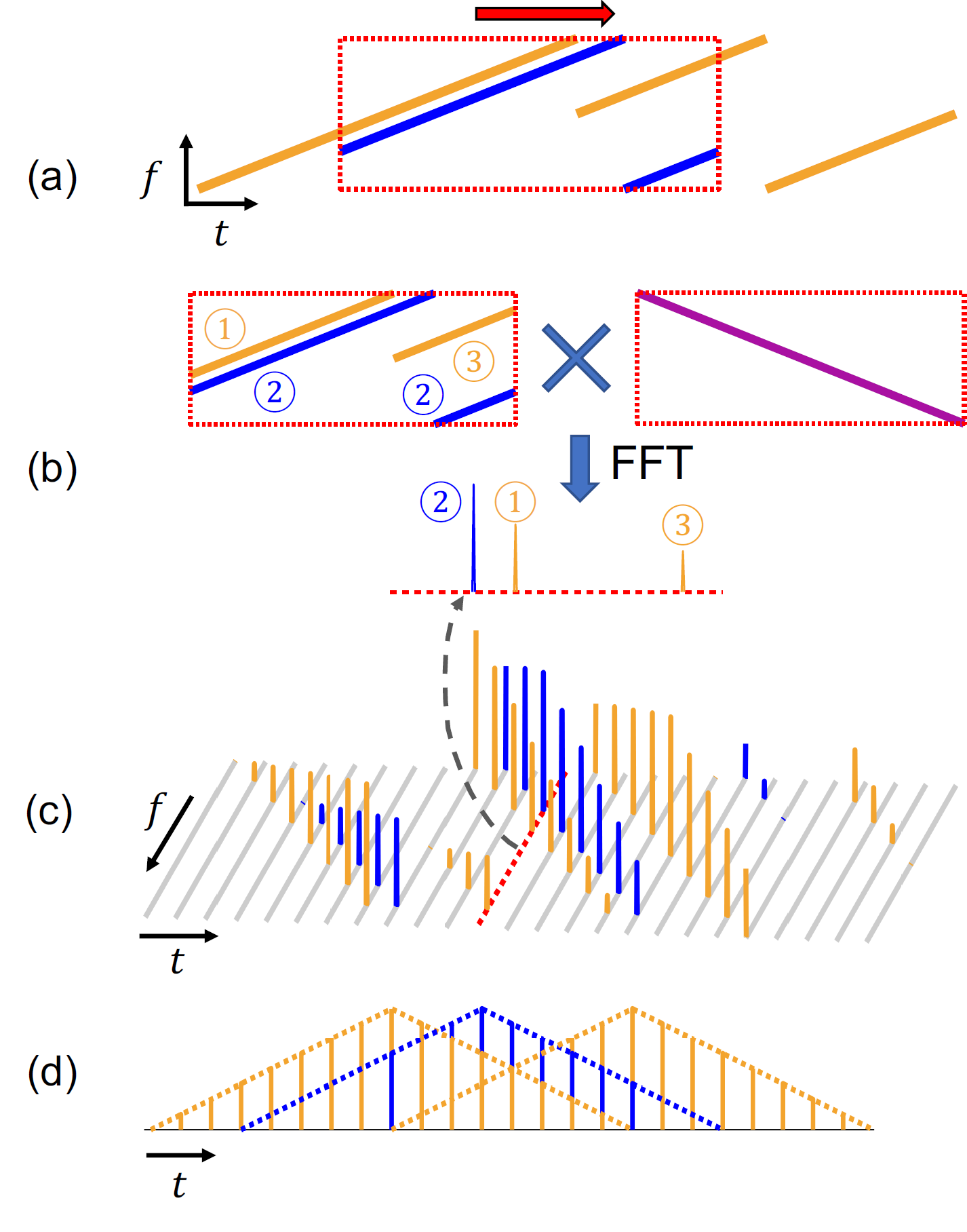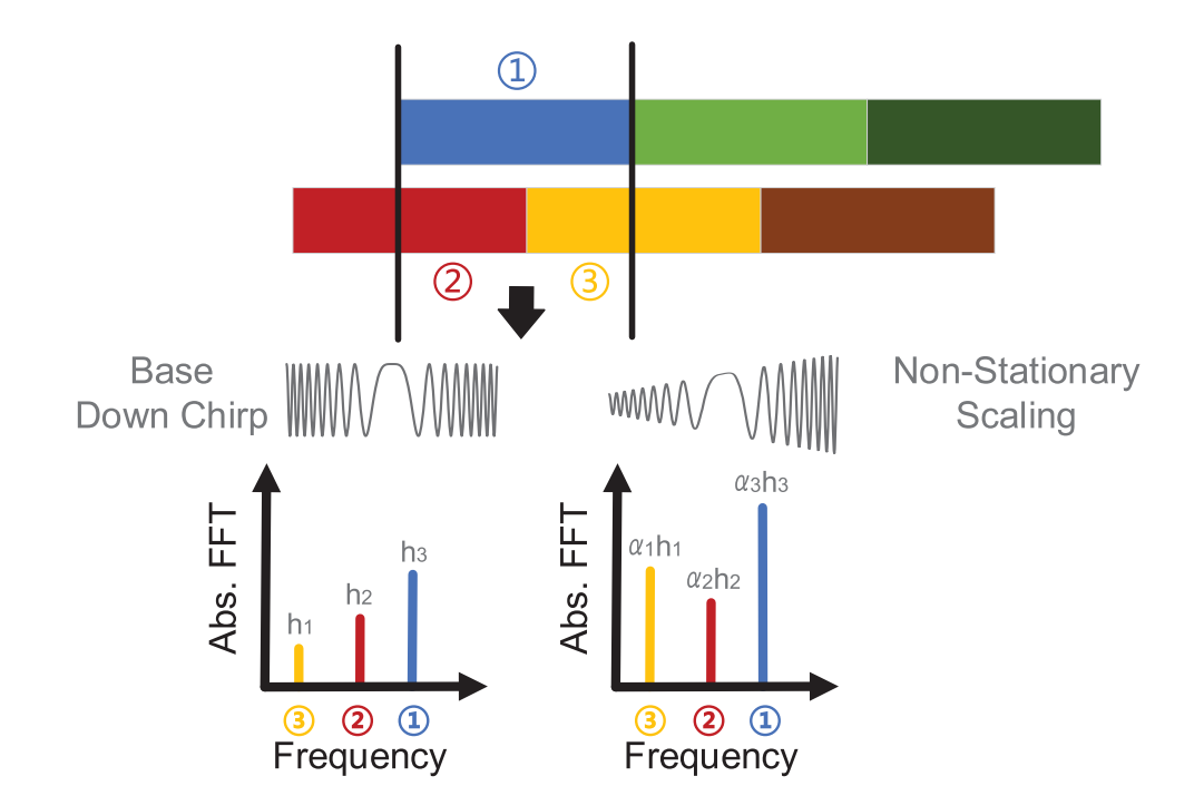 2) To further enhance the LoRa receiver’s collision-decoding capability and relax constraints on reception-window selection, we proposed NScale [7]—a collision-decoding protocol enabling arbitrary reception windows. NScale explicitly models the energy-distribution characteristics of LoRa symbols: symbols from different packets occupy distinct energy-distribution intervals within a given window. Prior to demodulation, NScale applies non-uniform amplitude scaling to the windowed signal. By comparing peak-height changes before and after scaling, it infers each symbol’s positional distribution within the window. Finally, exploiting the unique time-of-arrival signatures of different packets, NScale completes collision separation and decoding. Figure 13-1 illustrates NScale’s core idea.