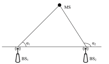 如图13-6所示,基站(BS)的位置已知,基站发送的信号到达两个被定位节点的到达角度分别为\alpha1\alpha 2。以基站为端点,两个到达角度为方向角的两条射线相交于接收节点,计算两条射线的交点即为被测节点的位置。