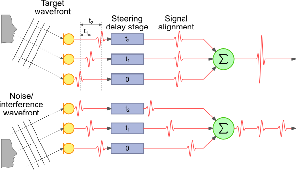 假设第i个天线接收到的信号为x_i\left(t\right),对信号的到达角度\theta进行遍历,将不同天线接收到的信号添加与到达角度对应的时延\tau_i(\theta)后进行求和,得到信号 $$ x\left(\theta\right)=\sum_{i=1}^{n}{x_i(t-\tau_i\left(\theta\right))} $$ 比较求和得到的信号的强度大小,使求和得到的信号强度最大的方向即为信号的到达方向,即 $$ \theta_{AOA}=\text{argmax}_{\theta}{x(\theta)} $$ 对于上图所示的三个麦克风组成的阵列系统而言,如果在其三个麦克风的后端添加了一个求和模块,对于来自不同方向的声波,其增益是不同的。从图中所示的例子来看,对于来自-45°和45°的声波,其增益均为1。然而对于来自0°的声波、其信号增益为3。使用这样的原理,我们就可以对每个麦克风接收到的离散的信号添加不同的延时值,使其在不改变阵列物理形状的条件下,对来自特定方向的声波信号进行增强。