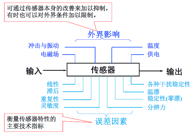 此外,根据影响因素不同,传感器的特性还可以分为内部特性和外部特性,前者主要体现为传感器的误差特性,是衡量传感器好坏的主要指标;后者体现为传感器对外界影响的敏感程度。