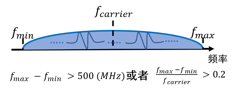 超宽带(Ultra Wide Band,UWB)技术指的是带宽大于500MHz或者相对带宽大于0.2的无线通信技术,如下图示例。