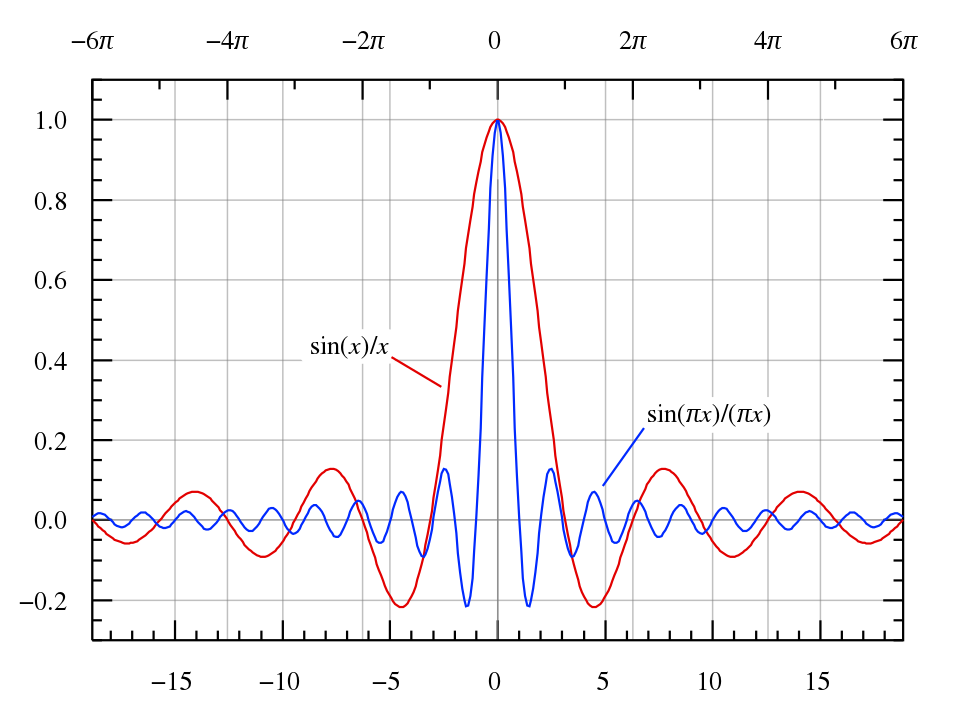 这个结果又叫sinc函数,其图像如下所示,在0处呈现一主瓣,距离中心越远旁瓣越小。