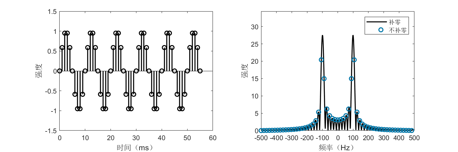 不同于整周期截断的信号,非整周期截断的信号会出现“频谱泄露”或者“失真”。如上图所示,蓝色圆圈不再处于峰顶。无论我们怎么增加采样时间,不补零的频谱始终告诉我们还有好些其他不同于100Hz的频率存在,且强度不小。在这种情况下,用补零提高频谱分辨率是必要的。