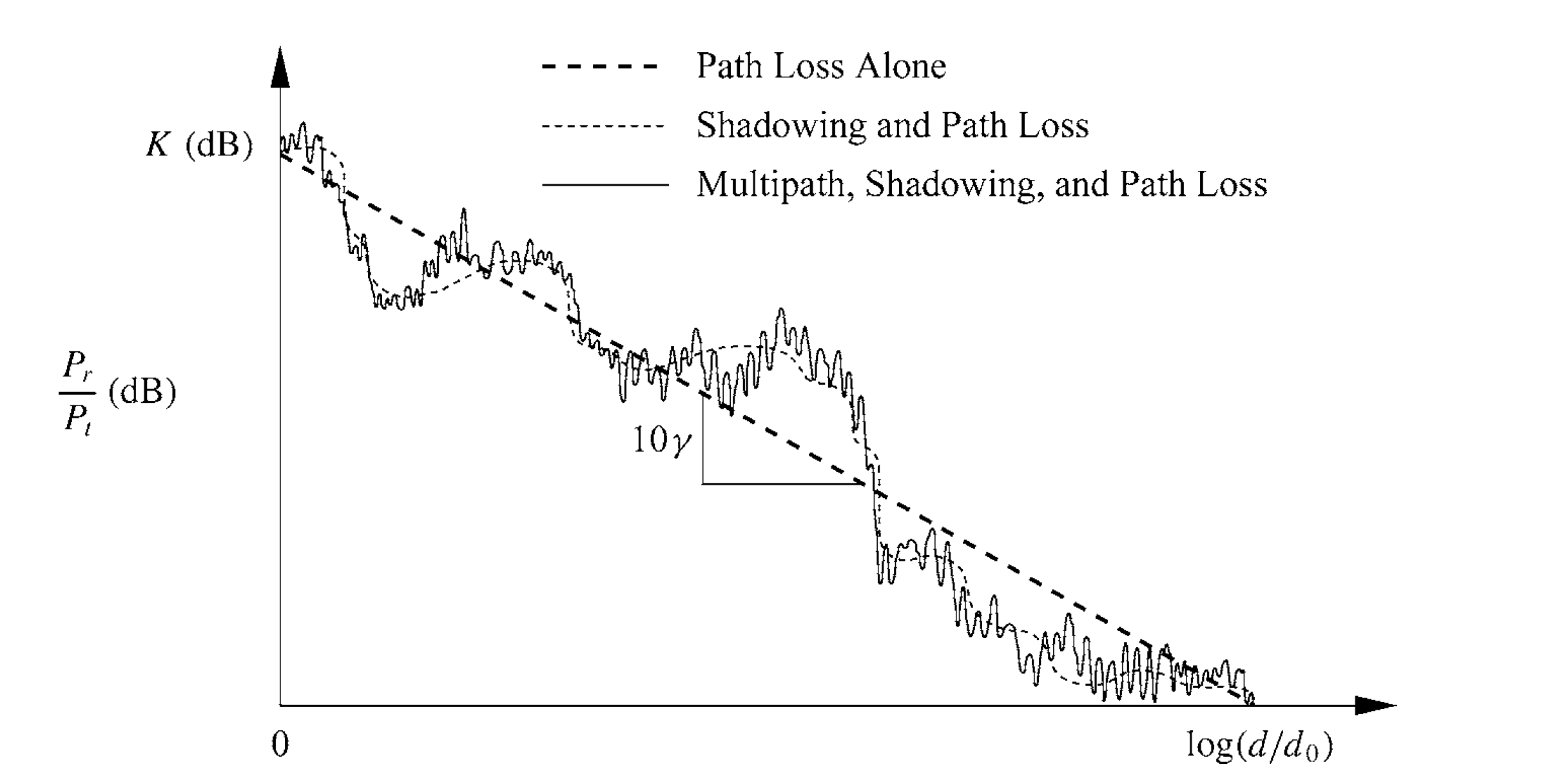 最终在接收端收到的信号强度与传播距离的关系如下图所示: