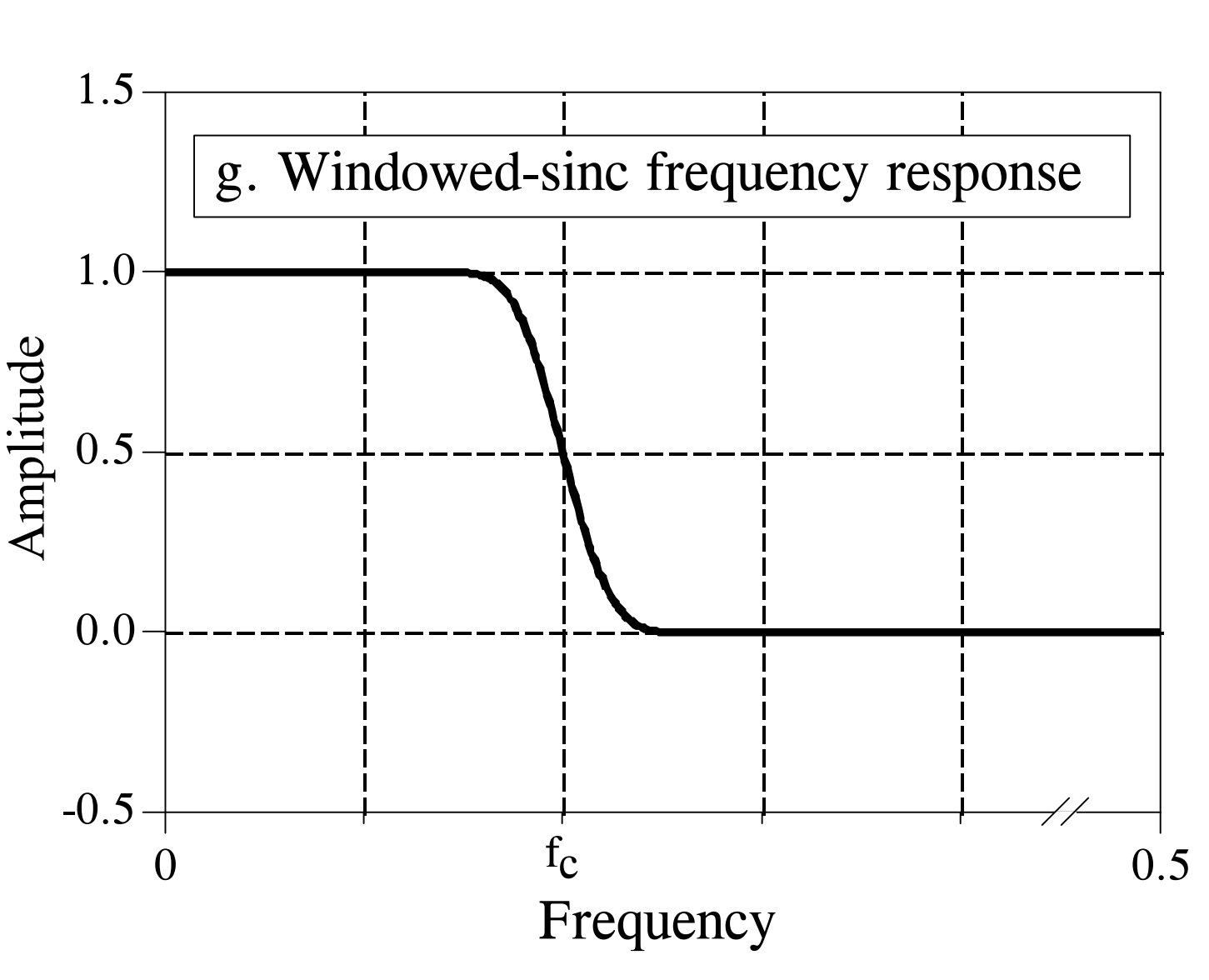 使用该滤波器内核对输入信号进行卷积可提供理想的低通滤波器。但问题是,sinc函数分布范围从负无穷一直到正无穷,不会随着时间增长而下降到零振幅。虽然在数学形式上,这个无限长的滤波器内核没有问题,但它对于计算机来说却是一个巨大的障碍——计算机显然无法处理无限长的信号。