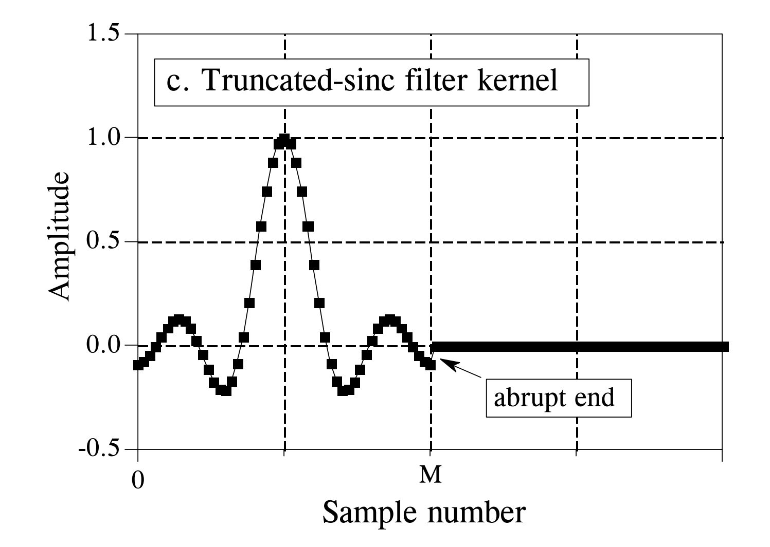 为了解决这个问题,我们可以对上图中的sinc函数做两方面的修改:首先,由于计算机能处理的信号点的数量是有限的,我们将理想低通滤波器的卷积核截断为M个点,在截断时围绕主瓣对称选择,其中M为偶数。这样的截断等价于将这些M点之外的所有卷积核样本点都设置为零。 其次,由于大部分程序设计语言智能支持正索引,我们将整个序列向右移动,使其分布范围为从0到M,这允许仅使用正索引来表示过滤器内核。经过这样处理之后的滤波器内核如下图所示: