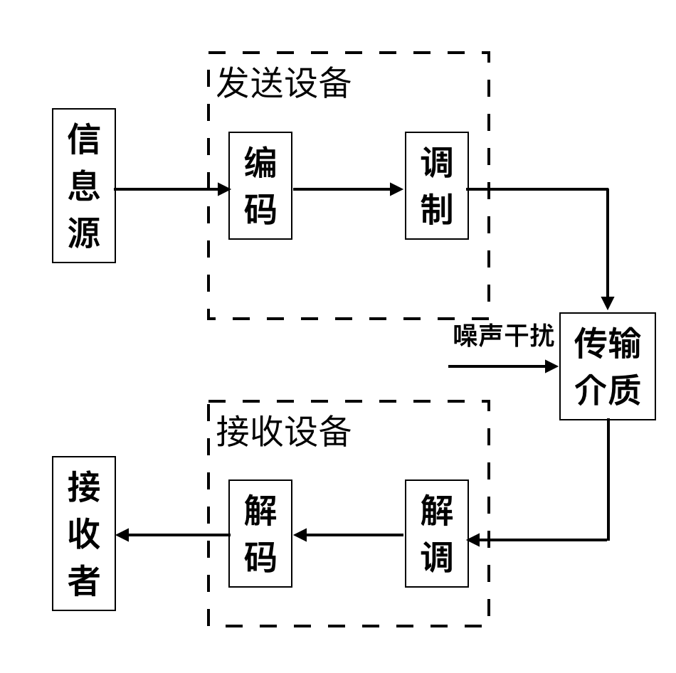 无线通信过程一般包含如下几个步骤:编码,调制,传输,解调,解码。如下图所示