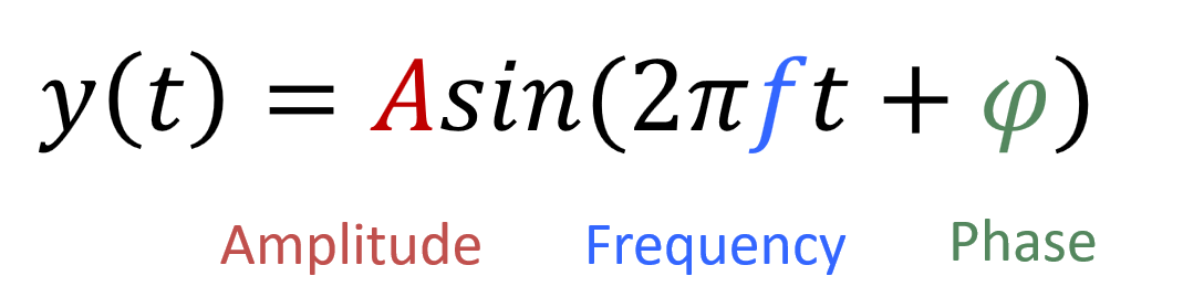 为了让接收方能够通过接收到的信号计算出发送方发送的二进制串,一个最朴素的想法是:我们用两个不同参数的正弦信号来分别代表“0”和“1”,只要发送端和接收端事先约定好哪种信号代表哪个二进制符号,就可以区分发送的数据。为了使发送的正弦信号不同,我们先来观察下图中的正弦函数公式:
