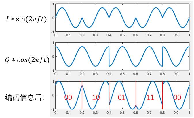 下图展示了I、Q基带信号、分别调制了信息的两路信号以及叠加后的信号。图中对应的I路和Q路数据分别是:I= \{\frac{ \sqrt{2} }{2},-\frac{ \sqrt{2} }{2},\frac{ \sqrt{2} }{2},-\frac{ \sqrt{2} }{2},\frac{ \sqrt{2} }{2}\},Q = \{ \frac{ \sqrt{2} }{2},\frac{ \sqrt{2} }{2},-\frac{ \sqrt{2} }{2},-\frac{ \sqrt{2} }{2},\frac{ \sqrt{2} }{2}\}
